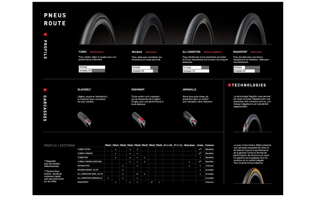 La nouvelle conception du pneu est issue de nombreuses années de développement et de tests internes. Elle dispose d’une construction centrale qui gomme les imperfections de la route et minimise la résistance au roulement, alors que la gomme GRIPTON® apporte le meilleur équilibre entre vitesse et adhérence en courbe. Ensuite, la large bande de roulement complétée de flancs stables qui procure une précision de pilotage à chaque virage. Et finalement, la bande de protection tissée Blackbelt™ renforce le pneu à la coupure et, en cas de crevaison, est relayée quasi instantanément par notre nouveau préventif.